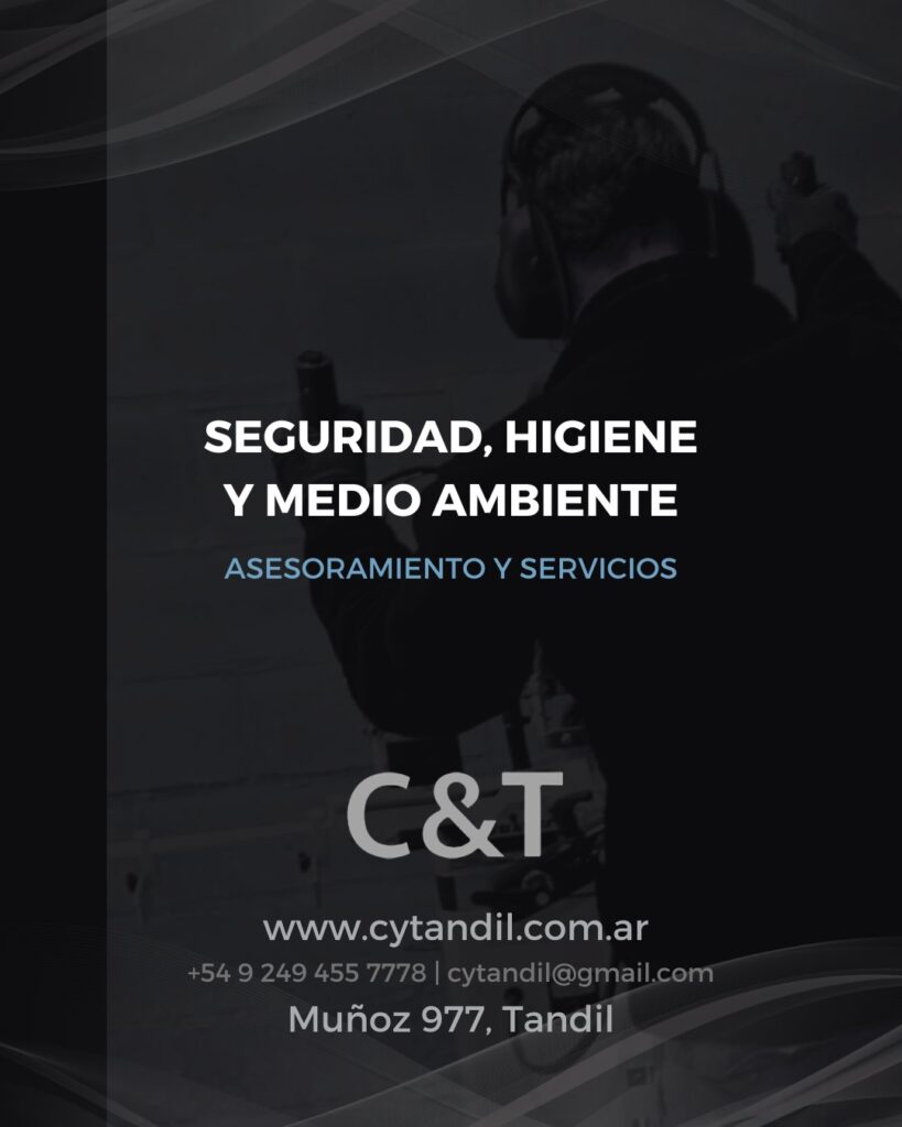 C&T – Seguridad e Higiene c&t Muñoz Nº977. Tandil, Bs.As. 54 9 2494 55-7778 cytandil@gmail.com 54 9 2494 55-7778 Comunicate por Facebook Instagram Whatsapp Link Especialistas en Seguridad, Higiene y Medio AmbienteAsesoramos a empresas comprometidas con el cuidado del medio ambiente y la seguridad de sus empleados. Volver